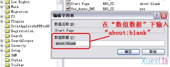 2、在打开的注册表编辑器左边文件夹列表中依次找到 HKEY_CURRENT_USER\Software\Microsoft\ Internet Explorer\Main,然后在右边的窗口中找到文件名为“Start Page”的文件双击打开,将“数值数据”里的内容清空并输入“about:blank”,点击“确定”按钮: