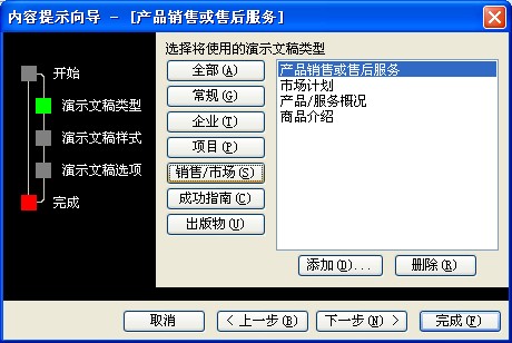 内容提示向导:可直接采用包含建议内容和版式设计的演示文稿,内容提示向导包括不同主题的文稿示例,例如论文、实验报告、培训、贺卡、项目总结等。用户可以根据自己的需要选择一种已婚丧嫁娶的模板,快速创建一份专业的淙文稿。