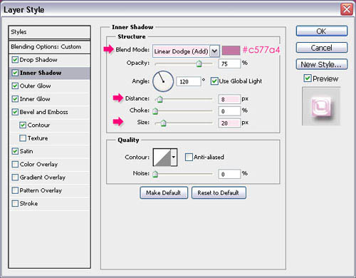 6、内阴影:更改混合模式以线性减淡(添加),其颜色为#c577a4 。另外,更改距离至8,大小到20。 |