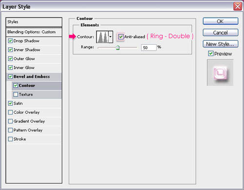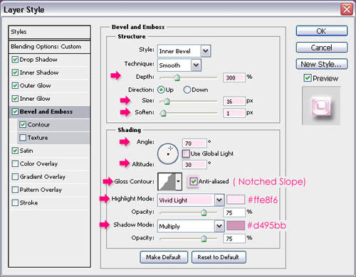 9、斜面和浮雕:更改深度到300 ,尺寸16 ,而软化1 。取消勾选使用全局光,更改角度对70和高度30 。更改 光泽等高线,选择缺口波浪 ,并检查消除锯齿方块。另外,更改高光模式为柔光 ,其颜色为#ffe8f6和影子模式颜色为#d495bb。 |