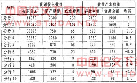 现以某商业银行10家分行在上述投入、产出指标上的数据,如下表所示。